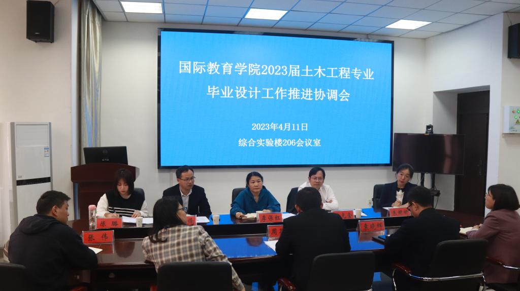为确保2023届土木工程专业(中外合作办学)本科毕业设计的顺利完成, 4月11日下午,在综合实验楼206会议室,威廉官网中国官方网站与国际教育学院联合召开2023届土木工程专业(中外合作办学)毕业设计推进会。国际教育学院院长李保红、副院长姚光金、副书记付春锋、教学秘书朱妍妍、2023届土木工程专业(中外合作办学)班主任陈璐;威廉官网中国官方网站院长周葆春、副院长袁晓辉、土木系主任高春华、教学秘书李卉、毕业设计指导教师代表张伟参会。