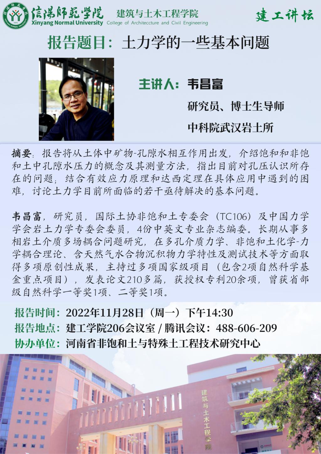 报告人简介:韦昌富,研究员,国际土协非饱和土专委会(TC106)及中国力学学会岩土力学专委会委员,4份中英文专业杂志编委。长期从事多相岩土介质多场耦合问题研究,在多孔介质力学、非饱和土化学-力学耦合理论、含天然气水合物沉积物力学特性及测试技术等方面取得多项原创性成果,主持过多项国家级项目(包含2项自然科学基金重点项目),发表论文210多篇,获授权专利20余项,曾获省部级自然科学一等奖1项、二等奖1项。