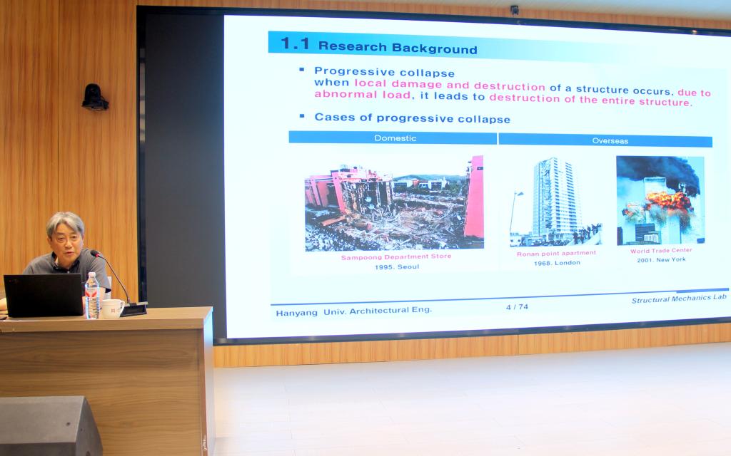 Noh Sam Young教授在报告中系统阐述了当前在恐怖袭击等极端事件中,因主要结构构件局部失效而导致结构整体坍塌的问题,并指出现行设计中缺乏有效的防控指导。针对该难题,他提出了一种基于《韩国建筑规范》(KBC)的结构体系渐进坍塌抗力评估方法。研究结果表明,依据KBC 2016设计的钢抗弯框架结构在常规工况下可满足渐进坍塌抗力的性能要求;而在极端情形下(如同时失去两根相邻立柱),采用焊接覆盖板翼缘(WCP-F)连接可显著提升结构的鲁棒性与安全性。此外,Noh教授还介绍了基于结构鲁棒性与敏感性指标的定量评估体系,为结构抗坍塌性能的直观分析和科学设计提供了有力工具,具有重要的研究价值与工程意义。