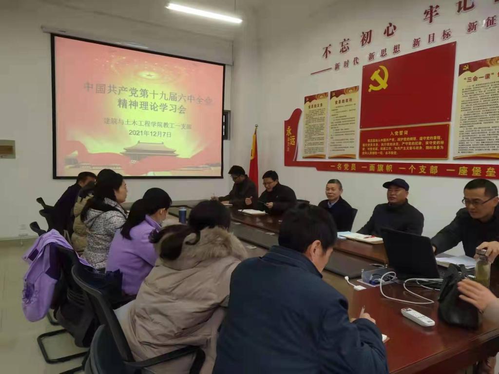 12月7日,教工第一党支部在综合实验楼402室“党员之家”召开支部党员大会,专题学习党的十九届六中全会精神。与会党员集体学习了《中共中央关于党的百年奋斗重大成就和历史经验的决议》。支部书记周峰对《决议》进行了梳理解读,回顾了中国共产党的百年奋斗重大成就和历史经验,解析了“四个伟大飞跃”、“两个确立”、“十个坚持”、“四个必须”等重要内容。随后,支部党员同志逐一交流讨论了自己的学习心得体会。大家纷纷表示,将切实把思想和行动统一到全会精神上,从百年党史汲取力量,用党的理论武装头脑,以实际行动践行使命,奋力推进学院事业高质量发展。