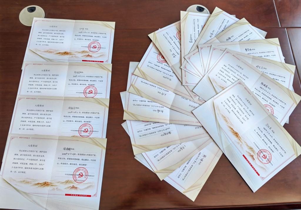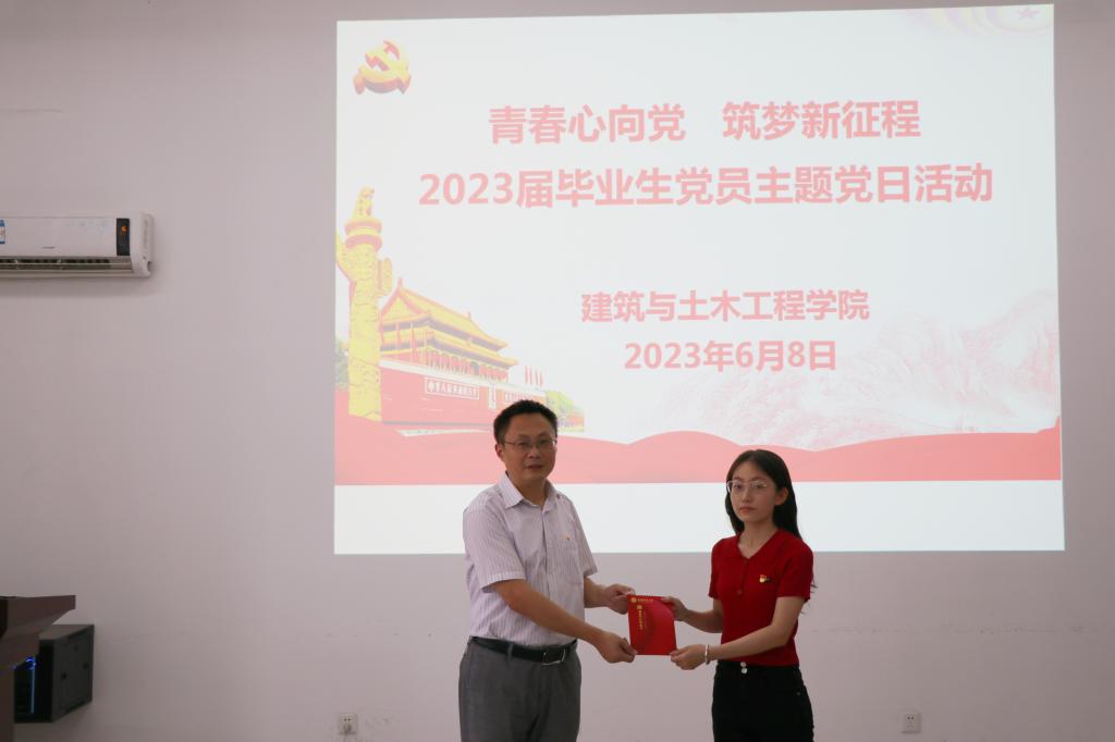 方明科和冀鹏为每位毕业生党员赠送了学院精心制作的“政治生日纪念卡”,激励毕业生党员们牢记自己的政治生日和党员身份,永葆党员本色,勇担责任使命,踔厉奋发,再启新程。
