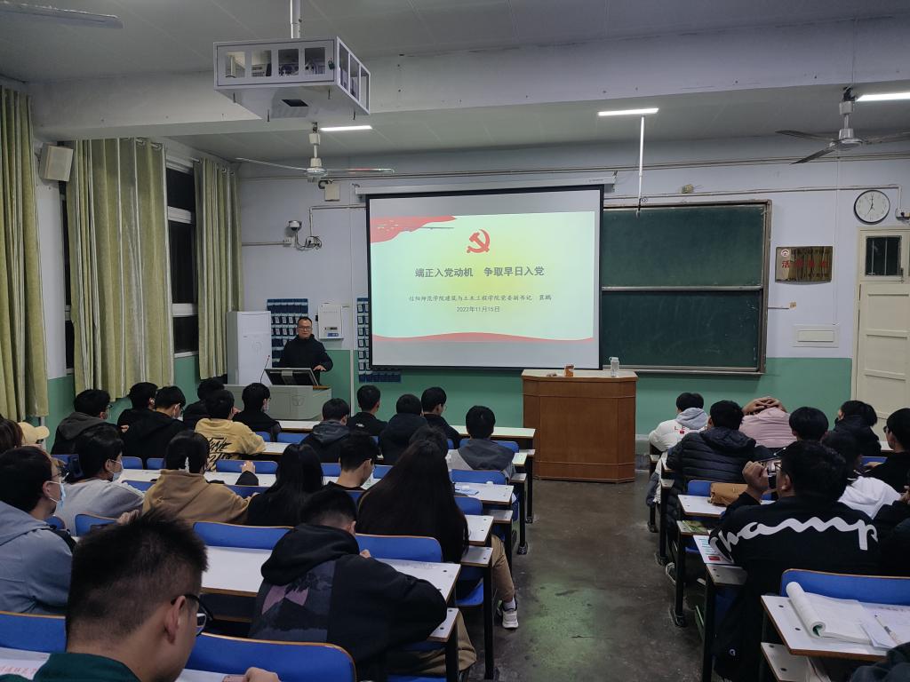 冀鹏以“端正入党动机,争取早日入党”为题做了主题报告。他首先带领同学们回顾了党的百年发展历程,让同学们在抗击疫情、脱贫攻坚和经济社会发展等工作取得的胜利成果中感受中国共产党的伟大,希望同学们能够深入学习“四史”知识,提升理论素养,为入党做好充分的准备。接着,冀鹏通过讲解党员发展程序,激励同学们端正入党动机,坚定理想信念,保持高昂斗志,勤奋刻苦学习,不忘初心,牢记使命,做勇担当、敢担当、能担当的新时代大学生,早日成长为一名合格党员。最后,冀鹏对同学们提出要求,希望同学们深入学习习近平新时代中国特色社会主义思想,坚定不移听党话、跟党走,矢志追求,努力拼搏,坚持按照“讲政治、有信念,讲规矩、有纪律,讲道德、有品行,讲奉献,有作为”的标准严格要求自己,以扎实学识和崇高修养成长为社会主义现代化国家的建设者和接班人。