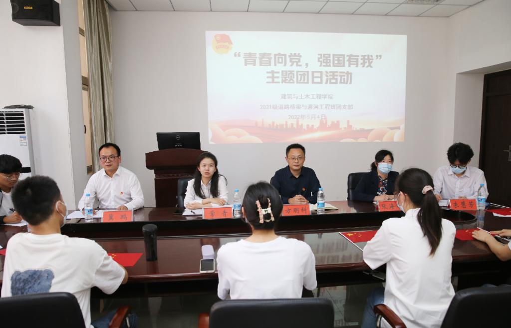 5月4日下午,威廉官网中国官方网站2021级道路桥梁与渡河工程班团支部“青春向党 强国有我”主题团日活动在综合实验楼206会议室举行。校团委副书记常青、威廉官网中国官方网站党委书记方明科、党委副书记冀鹏和共青团员代表共40余人参加活动。活动由班级团支书赵琦琦主持。