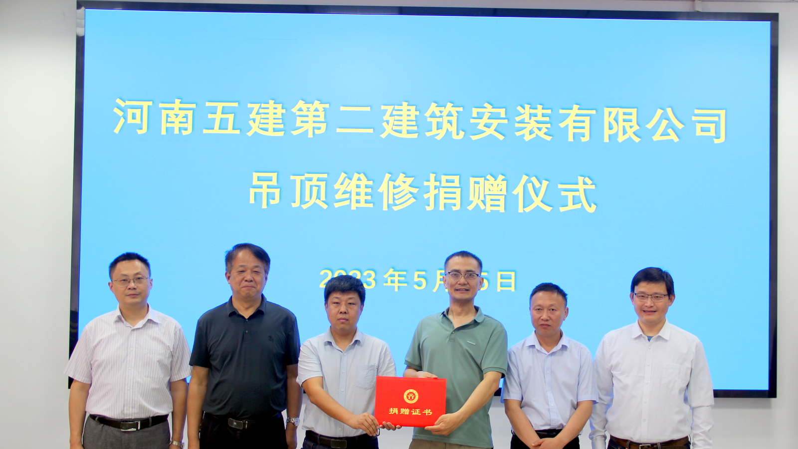 5月15日上午,河南五建第二建筑安装有限公司吊顶维修捐赠仪式在威廉官网中国官方网站206会议室举行。河南五建第二建筑安装有限公司副总经理吴建功、总工程师徐礼赞、项目经理贾善磊,威廉官网中国官方网站党委书记方明科、院长周葆春、办公室主任周峰参加了捐赠仪式。